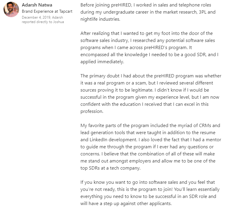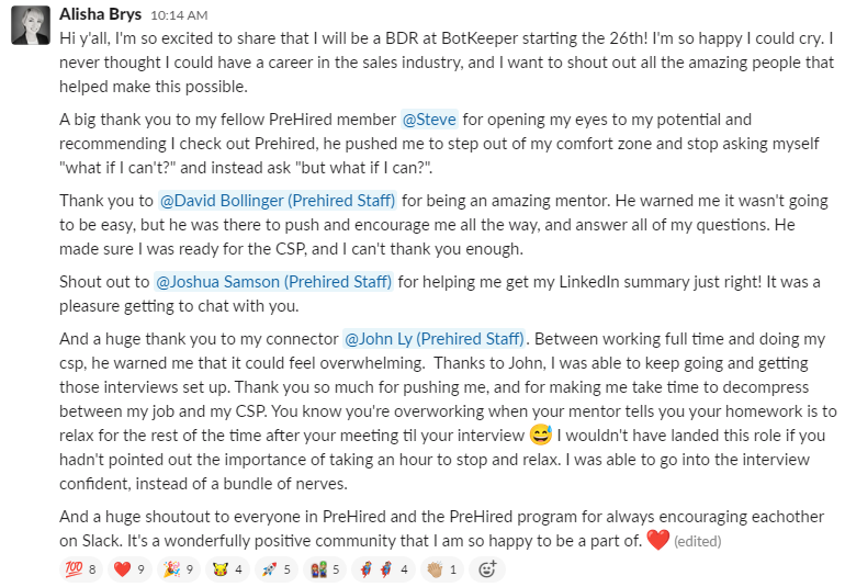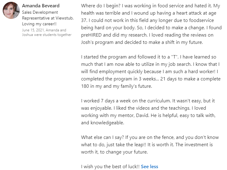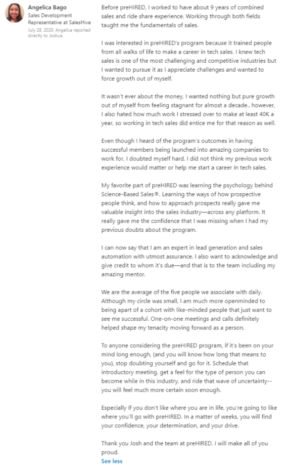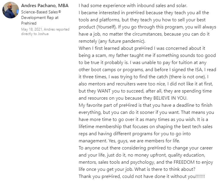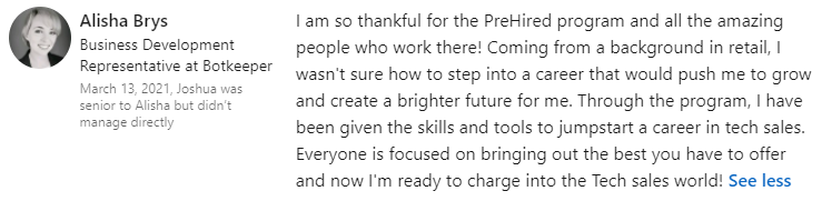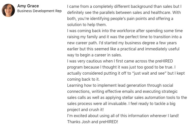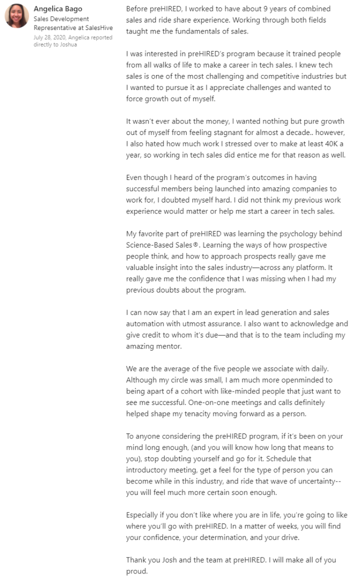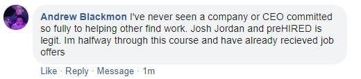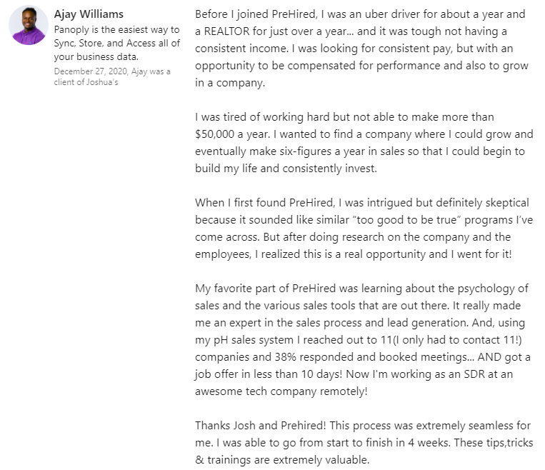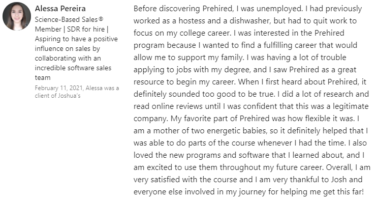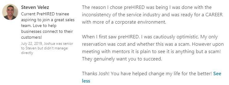 "It did seem too good to be true. $0 down and you can do it online... I didn't believe it. I was able to do a good enough job in the program where, through Prehired, I was referred to a partner company. In the first interview, I received an offer."