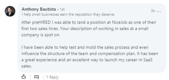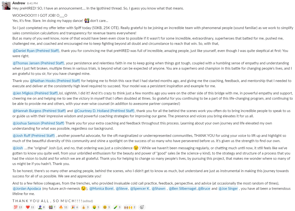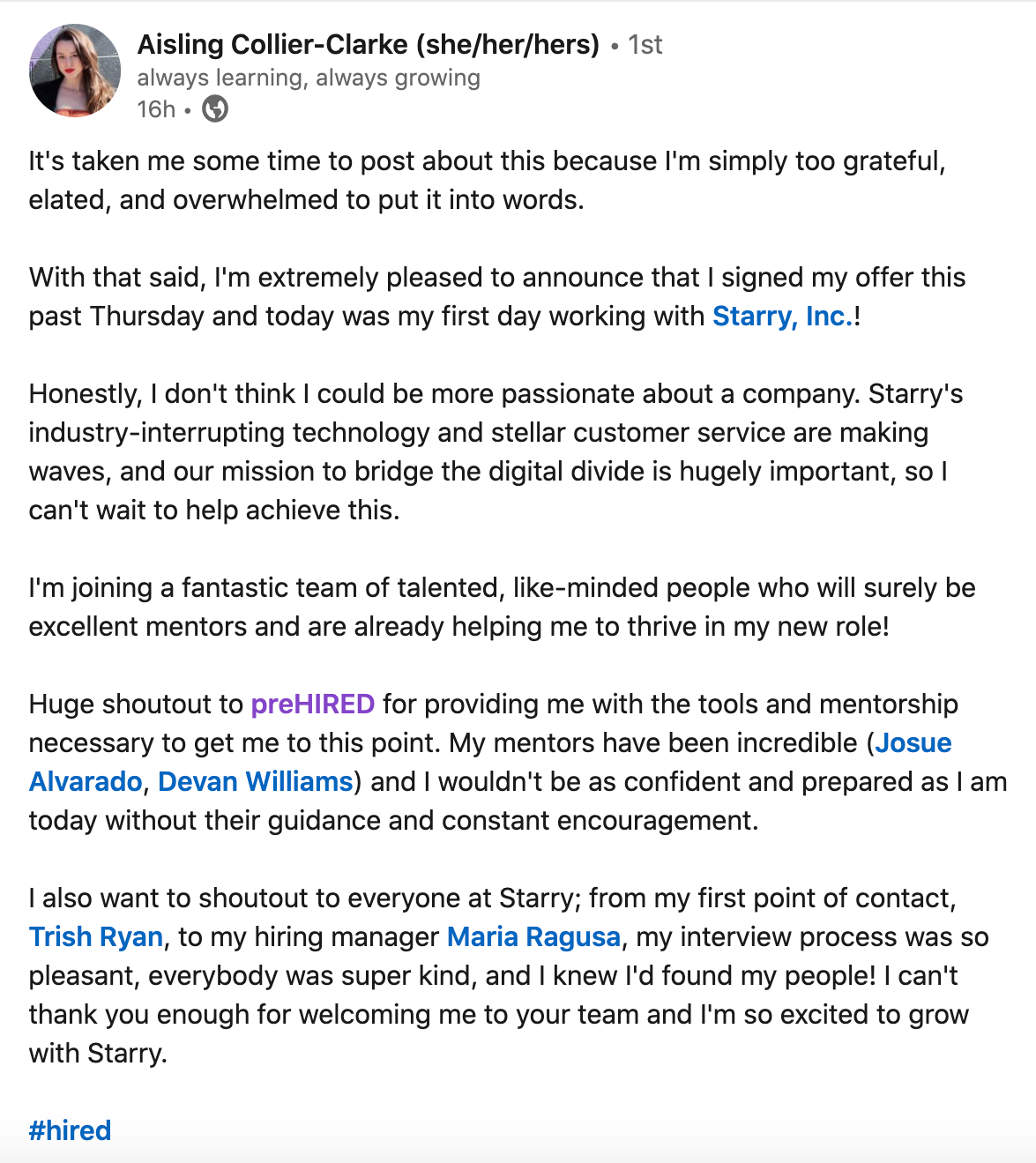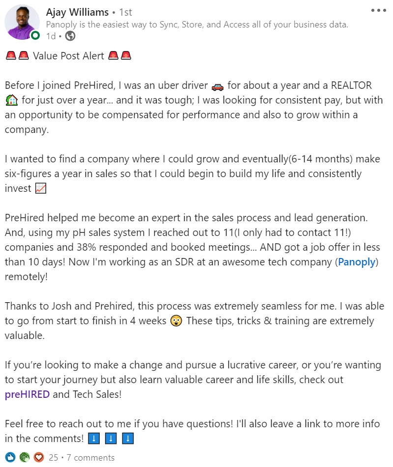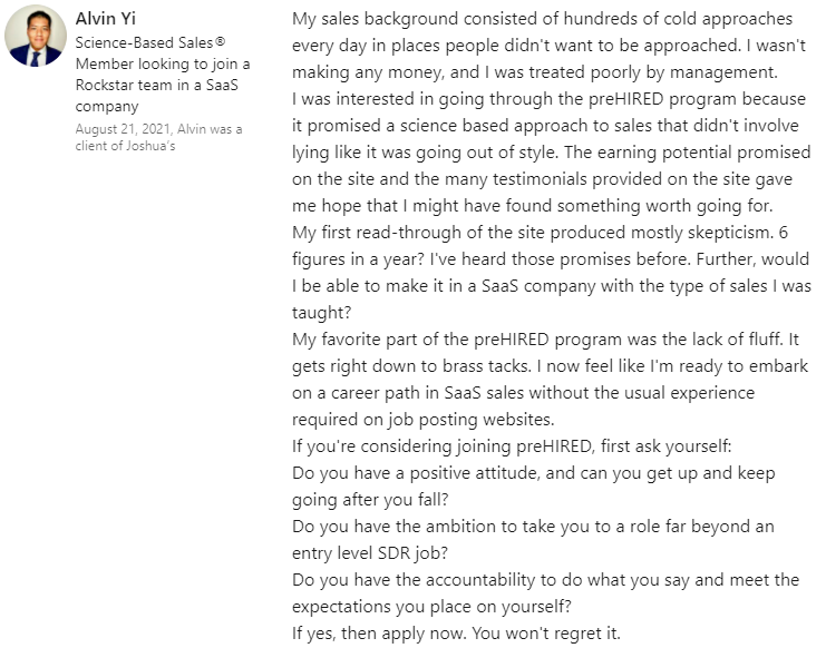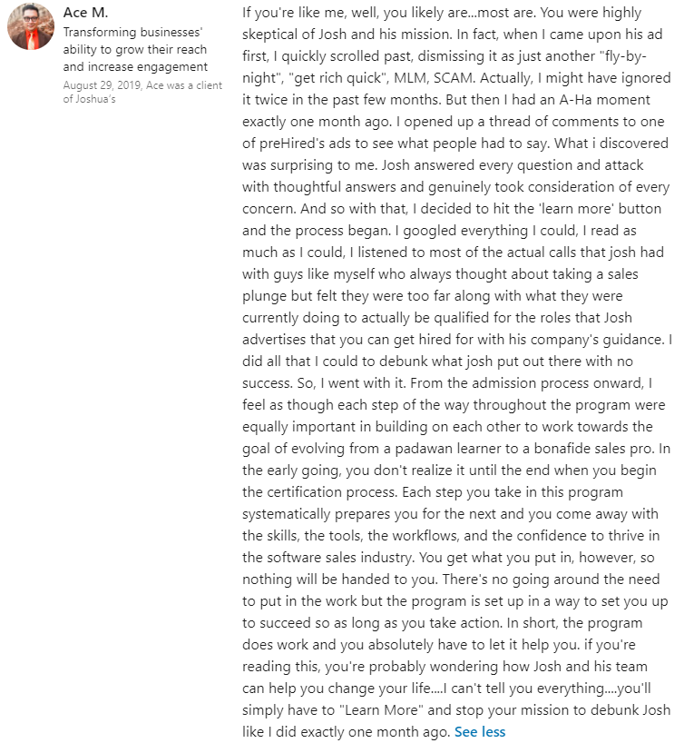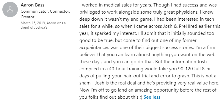 "It did seem too good to be true. $0 down and you can do it online... I didn't believe it. I was able to do a good enough job in the program where, through Prehired, I was referred to a partner company. In the first interview, I received an offer."