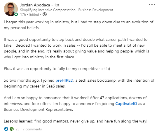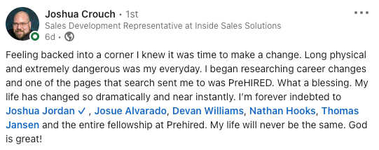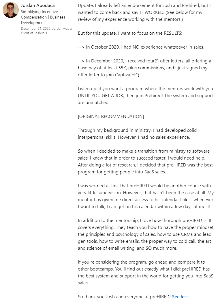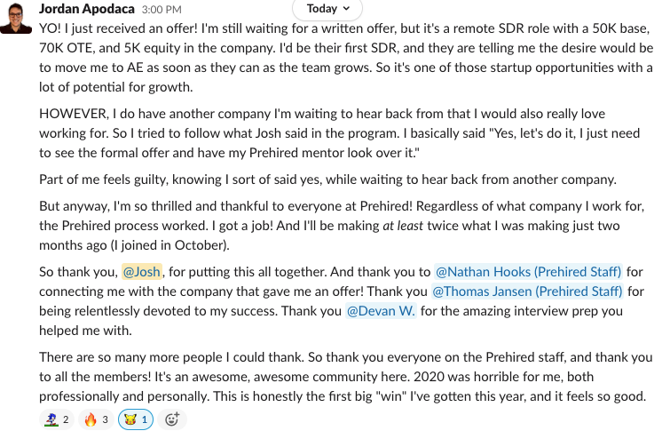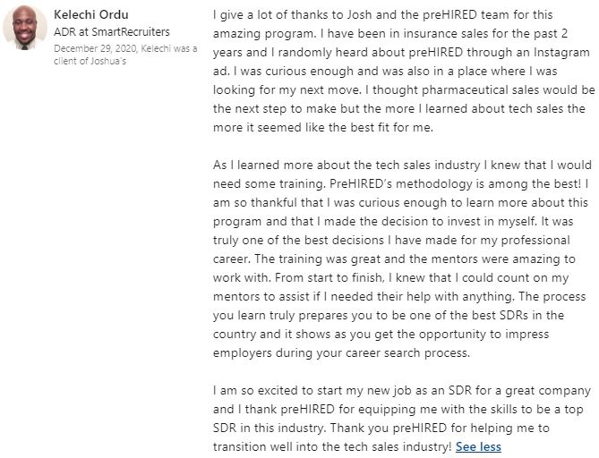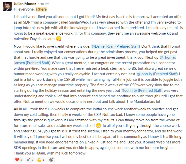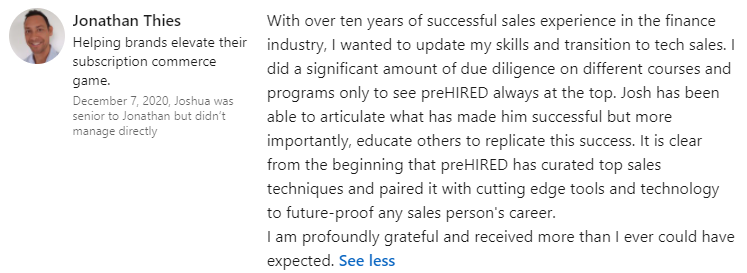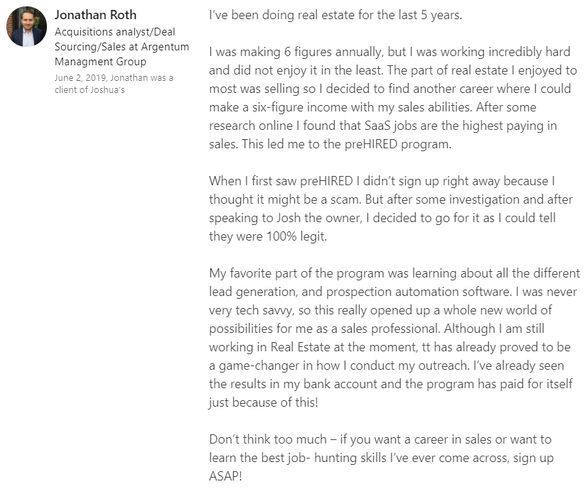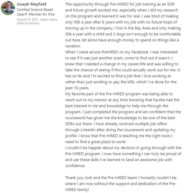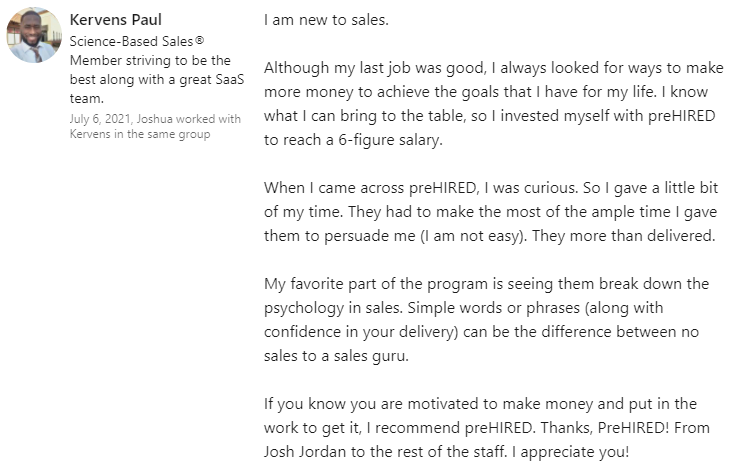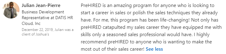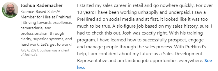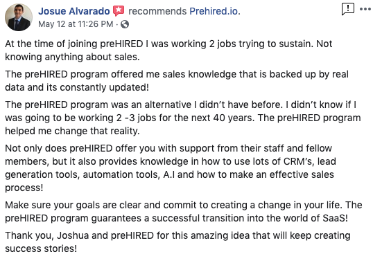 "After 10 years in sales, I didn't know what I was missing. Now I have too many job options... I just wish I had found Prehired years ago."