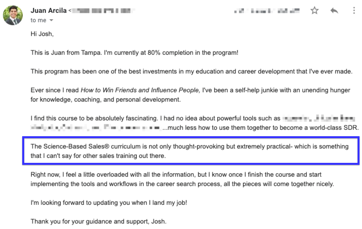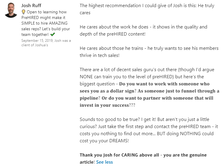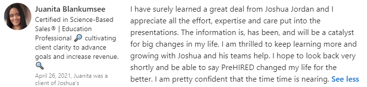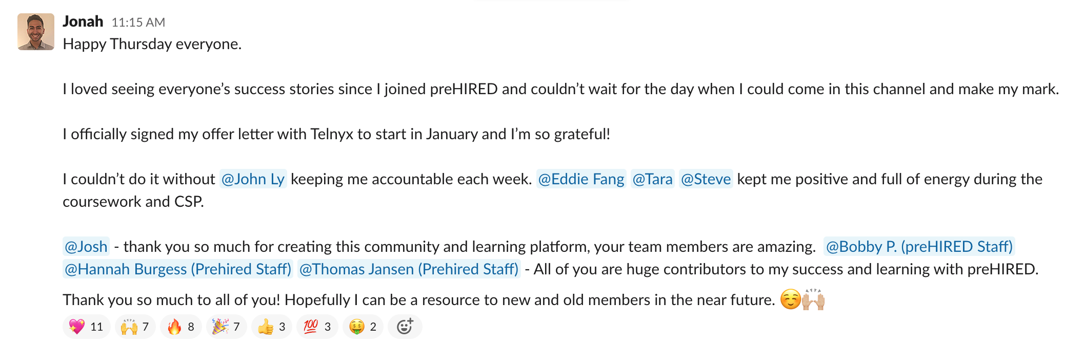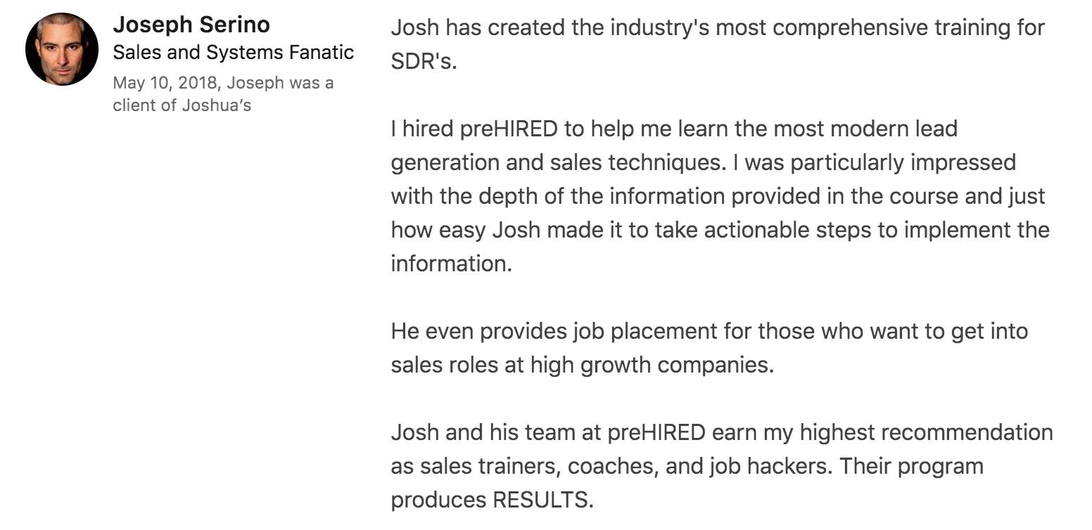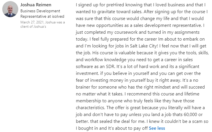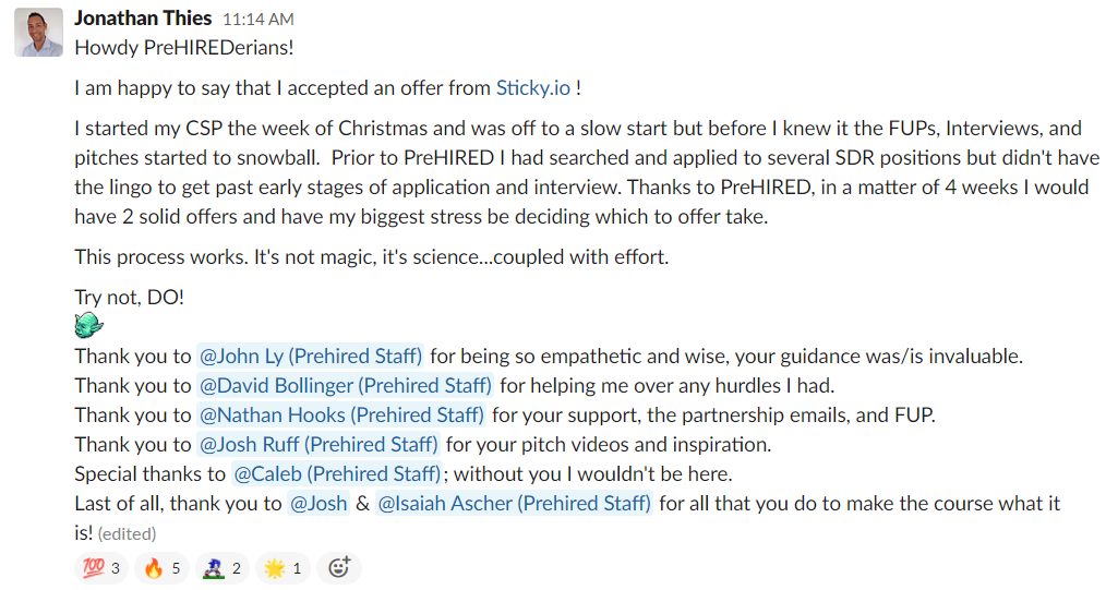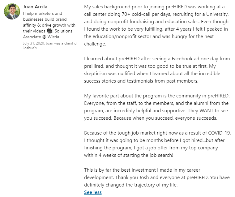 "After 10 years in sales, I didn't know what I was missing. Now I have too many job options... I just wish I had found Prehired years ago."